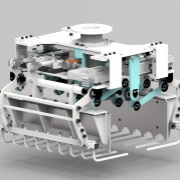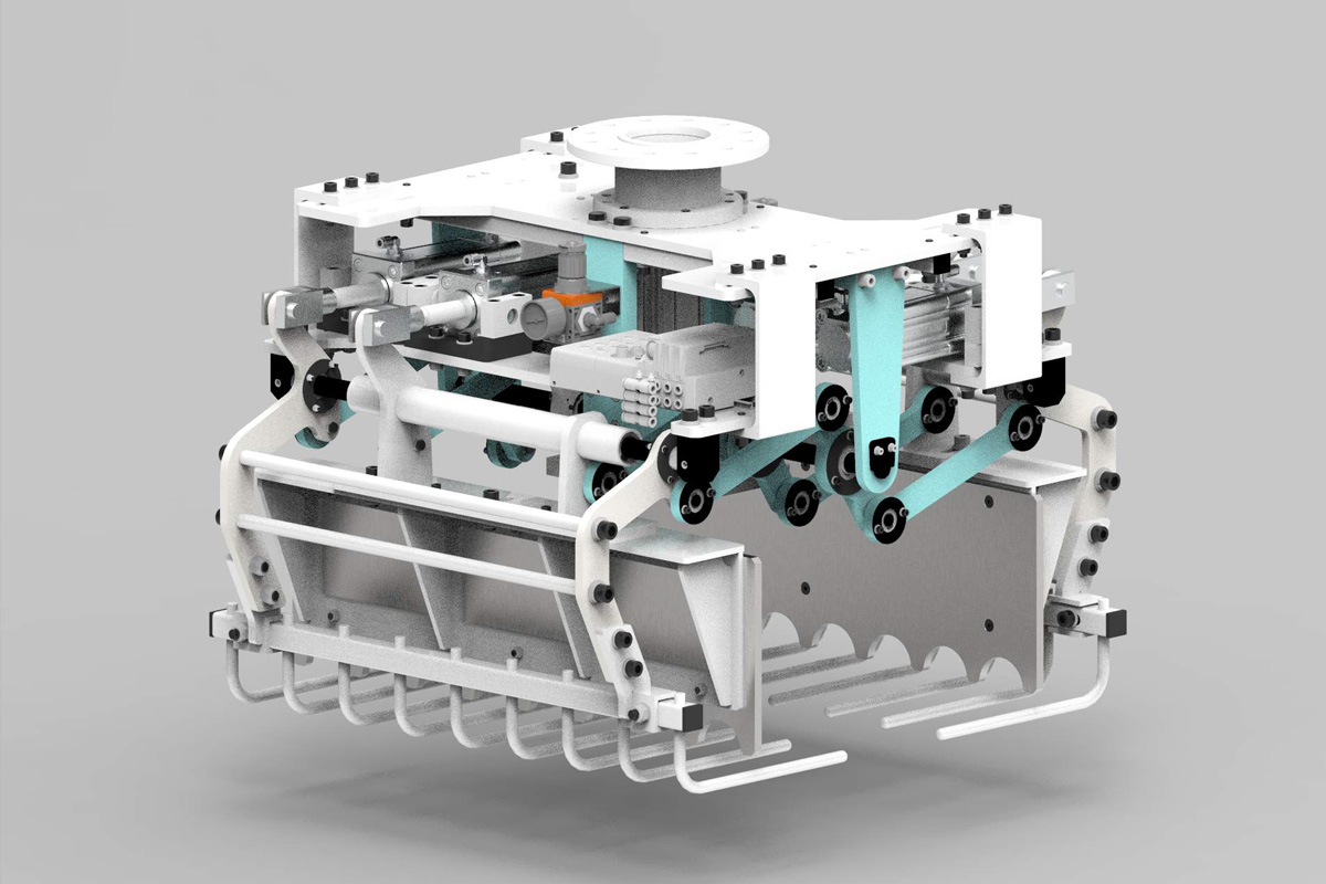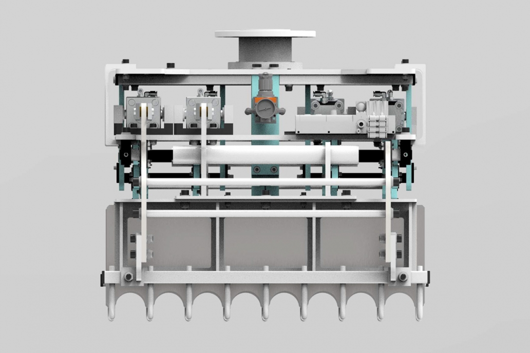 Chwytak do podawania pojedynczych worków został zaprojektowany tak, aby maksymalnie usprawnić proces paletyzacji. Konstrukcja działa w oparciu o pięć siłowników, które odpowiadają za widły, docisk górny i docisk boczny. Zastosowanie docisku bocznego dało nam realną korzyść niezawodnej pracy, która sprosta wyzwaniom dużej dynamiki dzisiejszej produkcji.